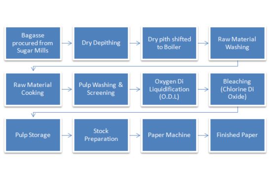 Bagasse is procured from sugar mills and is processed through double depither where approximately 80% of the total pith is removed. The raw material is then processed further and pulp is formed which will be used in the writing and printing division. The process of producing bleached pulp from raw material is as given in the following process flowchart.